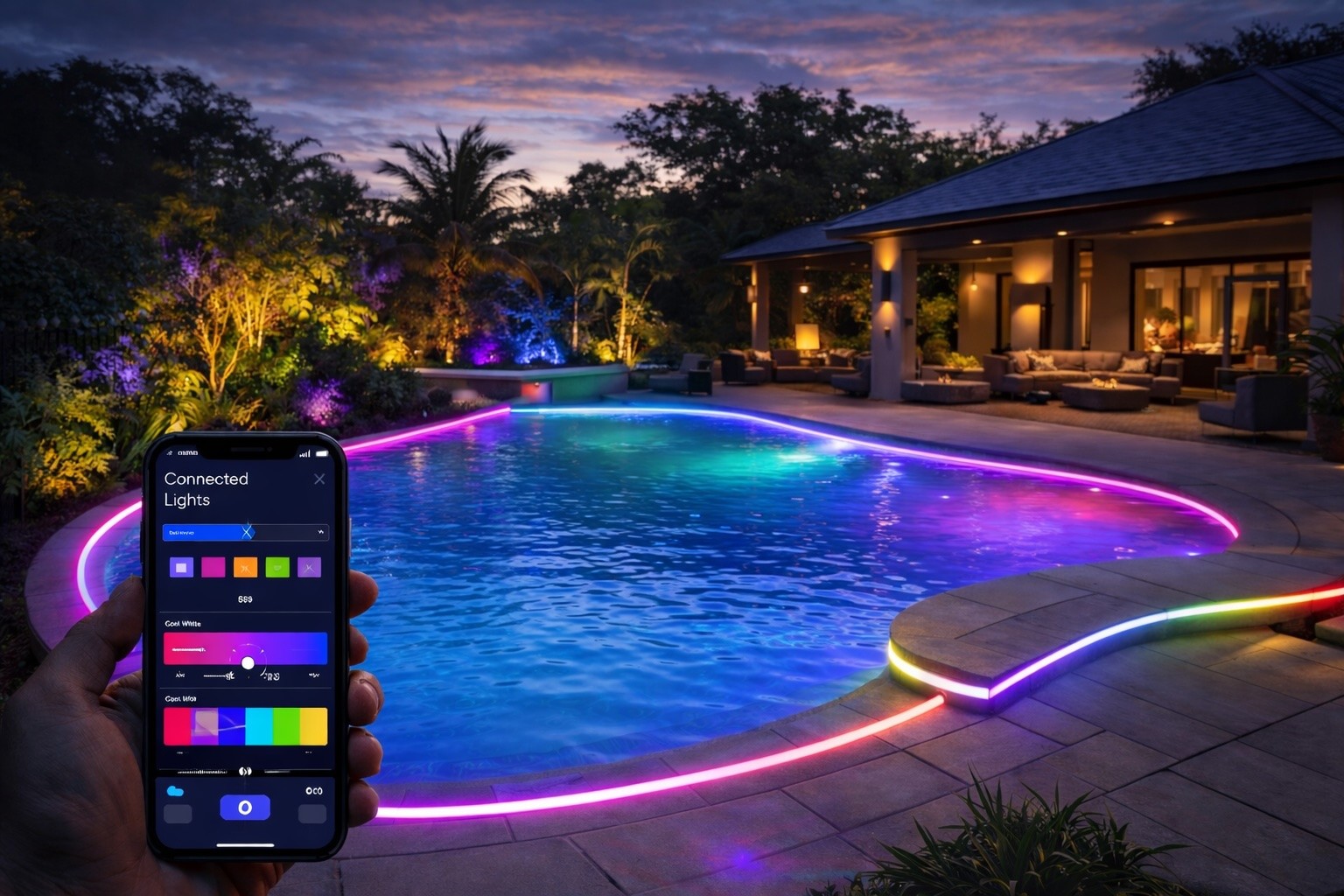 This outdoor lighting project transformed the client’s backyard into a vibrant entertainment space. We installed advanced LED lighting throughout the pool and surrounding landscape, featuring dynamic color-changing capabilities that synchronize seamlessly with music. The system allows users to control lighting scenes, brightness, and color patterns from a mobile device, creating the perfect atmosphere for relaxing evenings or lively gatherings. With weather-resistant fixtures and intelligent controls, the installation delivers both durability and stunning visual impact for outdoor living.